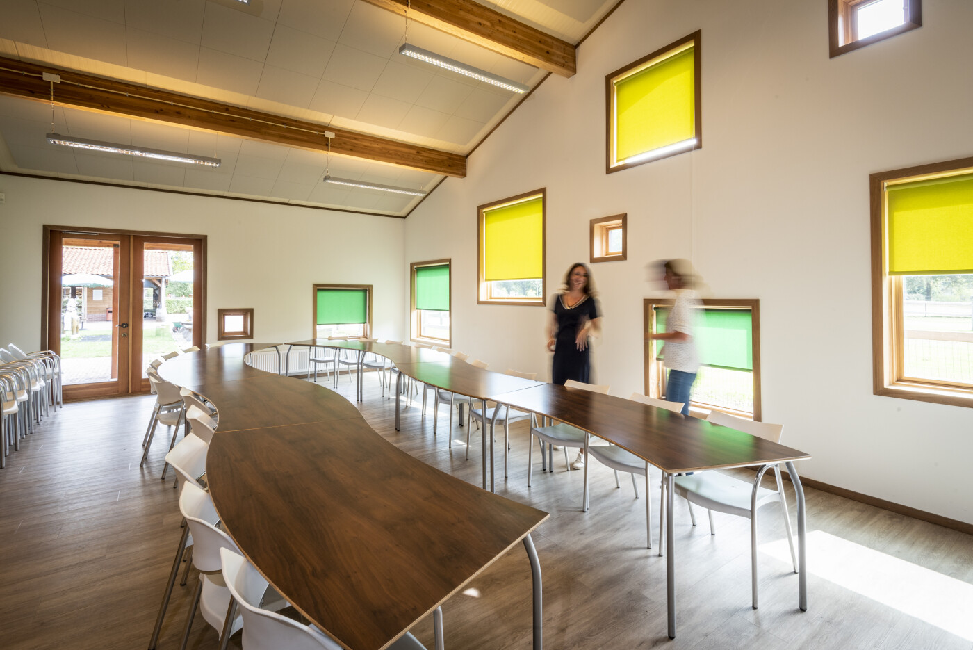 Deze mooie hoge ruimte heeft prachtig uitzicht over de ponyweide en het erf van de boerderij en is voorzien van alle moderne faciliteiten. Afhankelijk van de opstelling is de ruimte geschikt voor 25-40 personen.