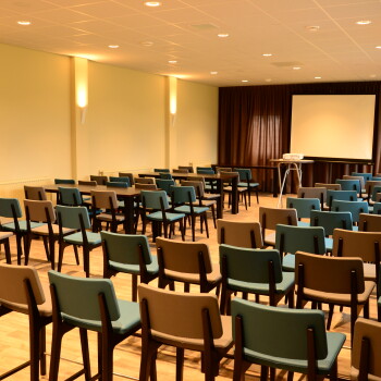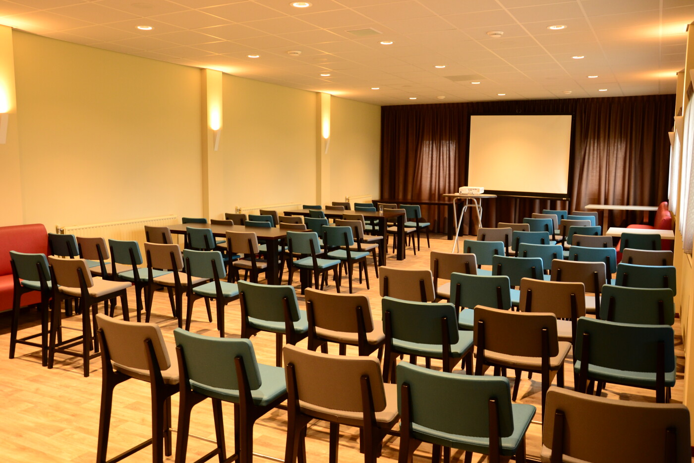 Beamer, scherm, podium, wifi, tv-aansluiting en geluidsinstallatie beschikbaar en in prijs begrepen